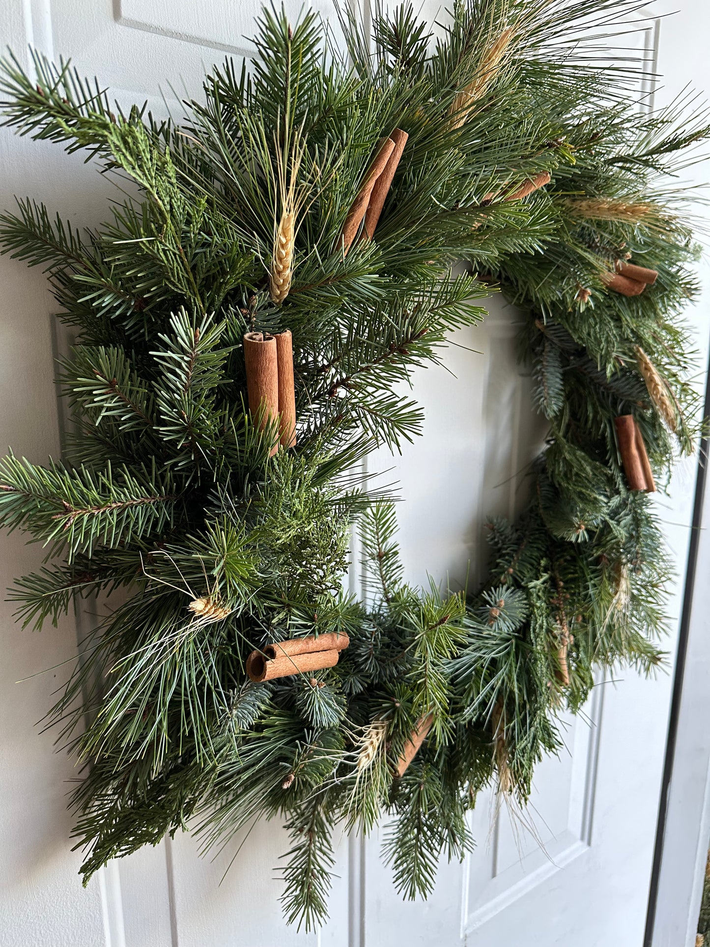 Every piece features a fragrant mix of fresh-cut pine, cedar, arborvitae, and fir, accented dried wheat grass and cinnamon sticks.