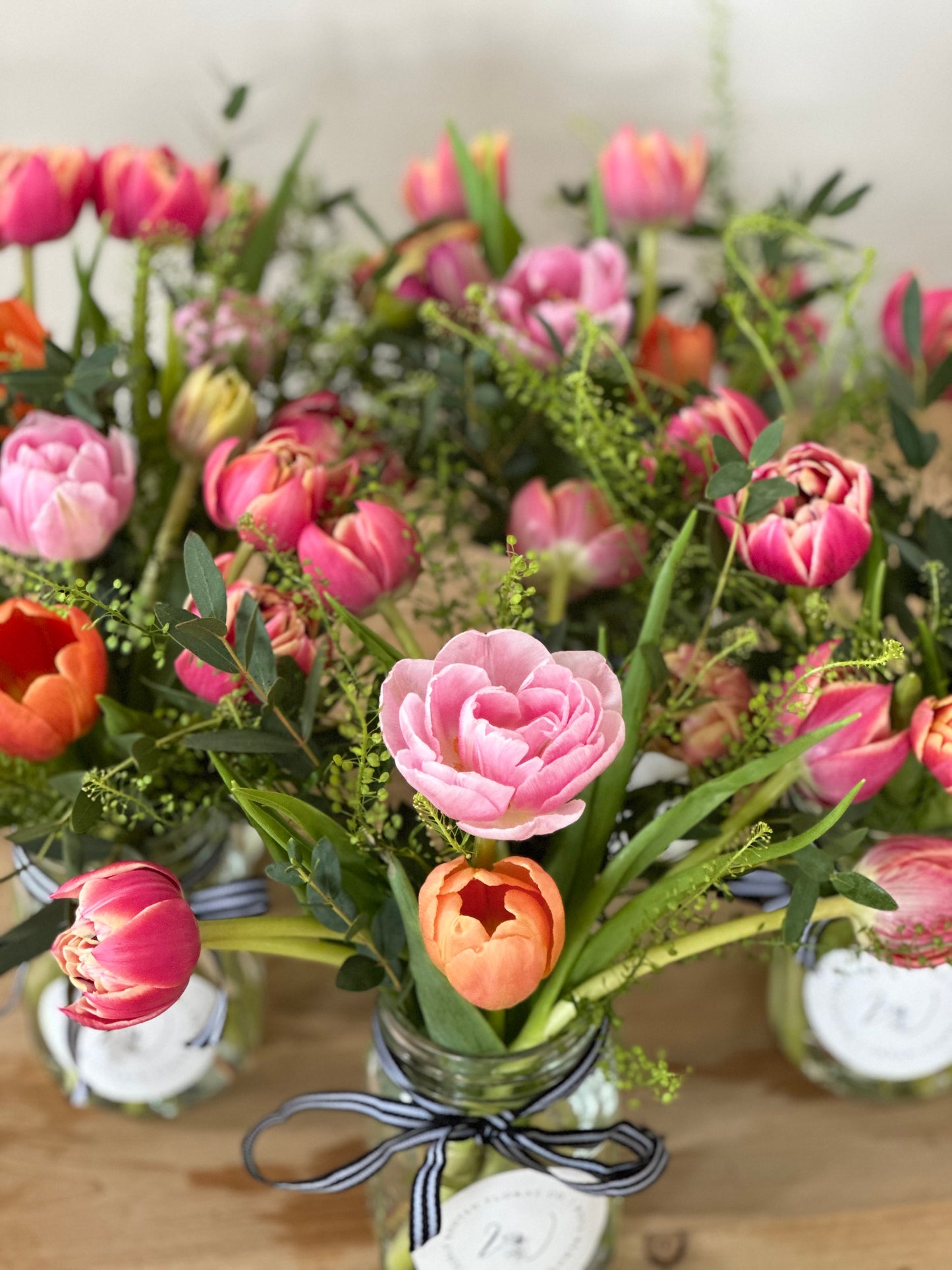 Each arrangement includes 8–10 locally grown specialty tulips arranged in a quart mason jar, finished in our signature Wildly Rooted style.